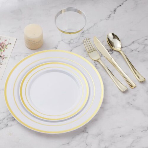 • WHAT YOU GET – Our 600-piece disposable dinnerware set is tailor-made for your 100 guests. You will receive a comprehensive package featuring 100 gold plastic plates 10.25”, 100 salad plates 7.25”, 100 cups 9 OZ, 100 knives, 100 forks and 100 spoons.