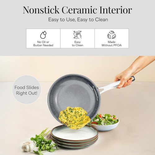 • HEALTHY & NON-TOXIC – The Granitestone nonstick pots and pans set coating is composed of ceramic and reinforced with titanium, ensuring this frying pan free of PFOA, PFOS, lead & cadmium for an eco-friendly, healthy experience for your entire family.