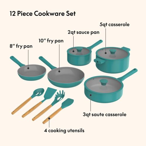 - ALL-IN-ONE SET: Includes 8” and 10” fry pans, a 3qt sauté pan, 2qt saucepan, 5qt casserole, and 4 wood and silicone utensils. Perfect for everything from ramen to casseroles, this cooking set equips you to create any dish with ease and style